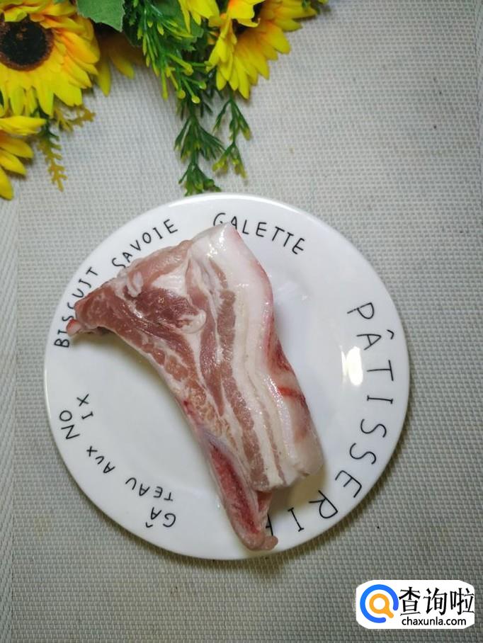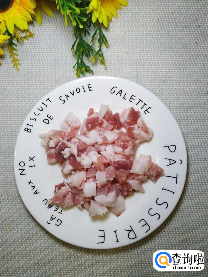 准备一块五花肉,洗净后,切成肉丁,放入盘中备用。小贴士:不要切太碎,这样口感更好。
