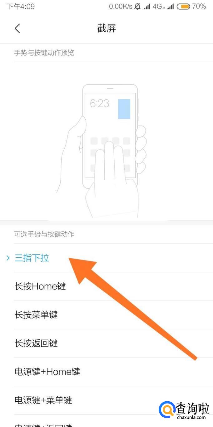 打开三指下拉快捷截屏方式后,用三个手指下滑屏幕即可快速截屏。