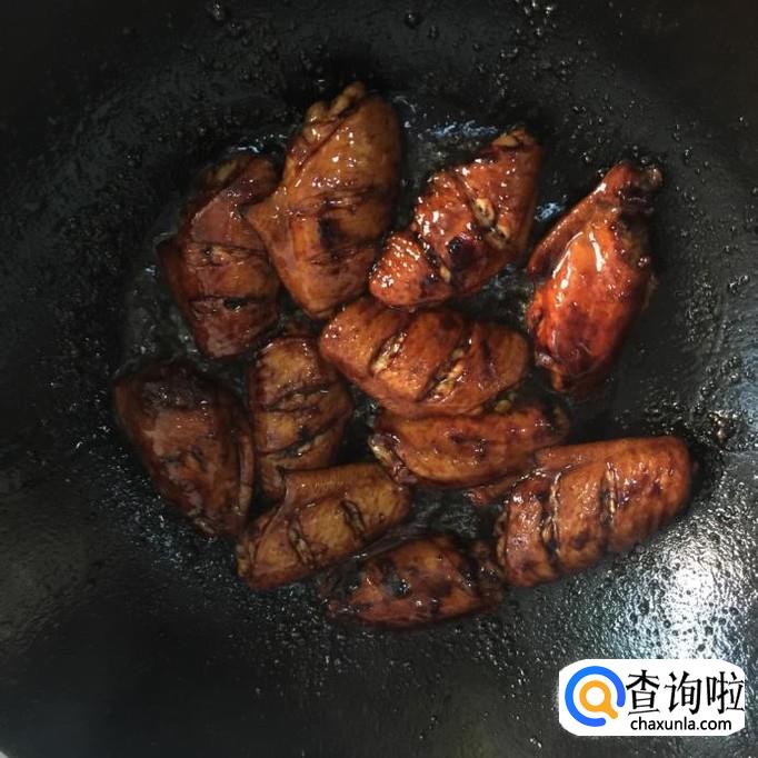 最后一步倒入可乐没过鸡翅,大火煮开小火收汁,收汁时要用铲子不停的翻动,当鸡翅上裹上焦糖色就可以装盘了。