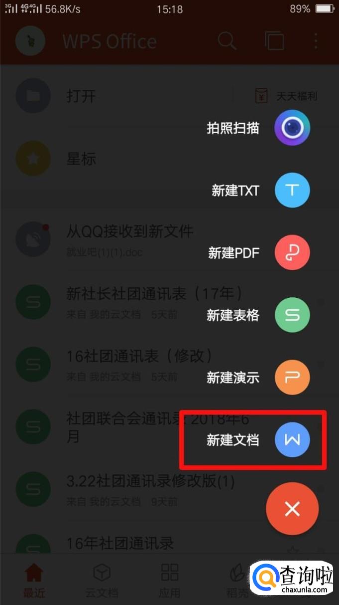 首先进入WPS首页,然后点击右下角的“+”符号,就会出现下图所示的选项,点击“文档”进行创建,也就是小编框起来的地方。
