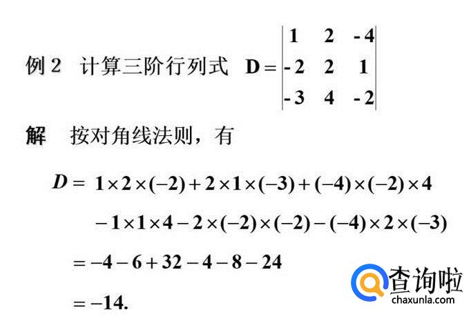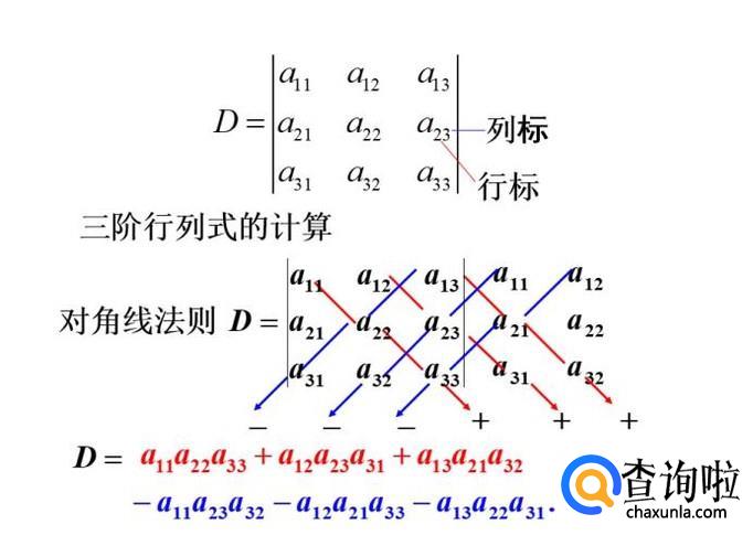 行列式分为,主对角线(红色线条),副对角线(蓝色线条)。三阶行列式的解,用主对角线的数的乘积的和,减去副对角线的数的乘积的和。