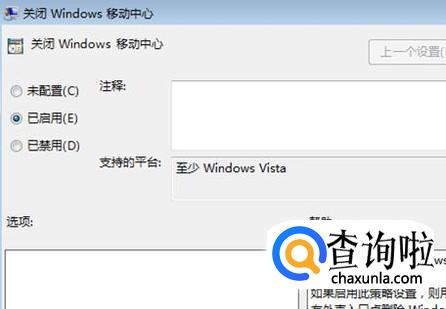 在右边找到“Windows移动中心”,在上面双,会看到“关闭Windows移动中心”是“已启用”状态(Windows移动中心关闭了,当然打不开了)。在上面双击。