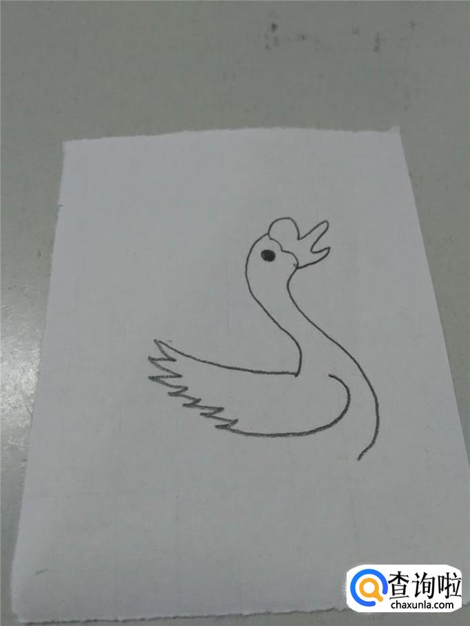 从鹅头顶往下画一个长长的S形,从下片嘴往下,再画一个更长的S形,两个S形之间组成了鹅长长的脖子,在鹅头上,再画一个黑点,表示眼睛。