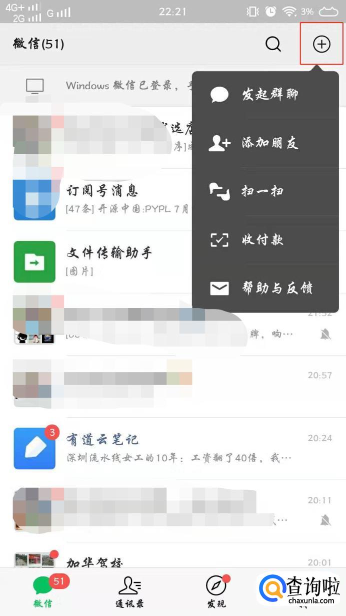 打开微信,点击右上角的【+】号。