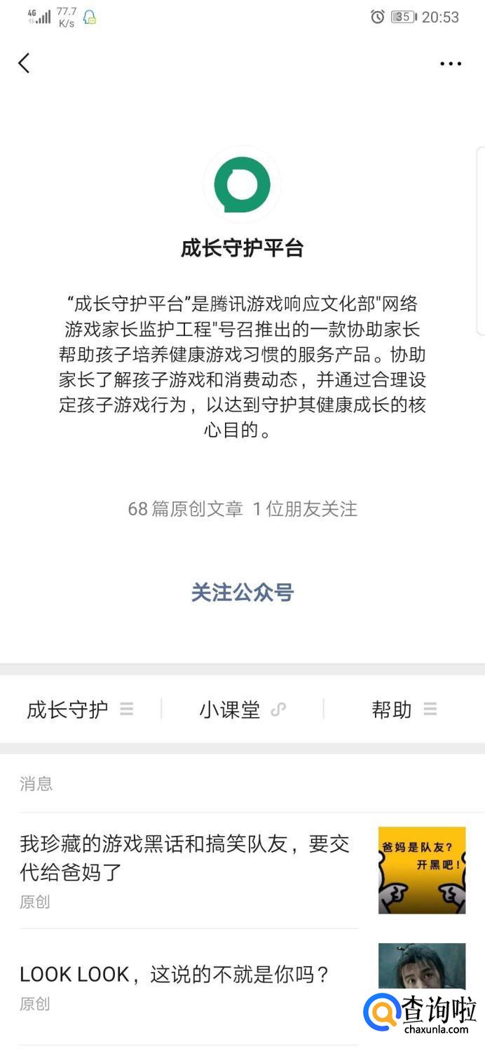 首先我们打开微信,搜索并关注“成长守护平台”公众号。