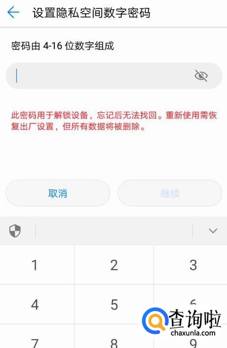 然后设置隐私空间的数字密码,再确认一遍密码,然后等待几秒创建隐私空间。