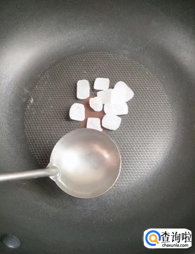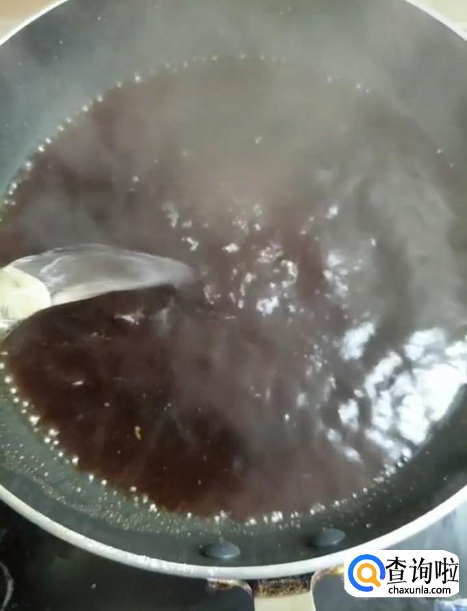 接着我们在锅中放入适量的冰糖,放入一勺清水,熬至焦糖色,倒入适量的开水