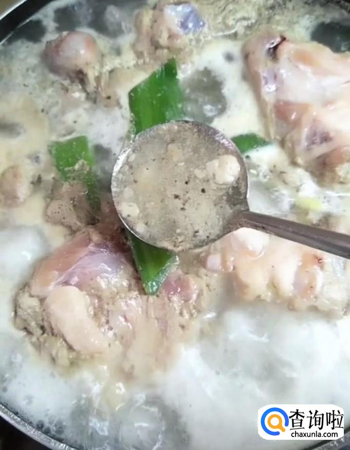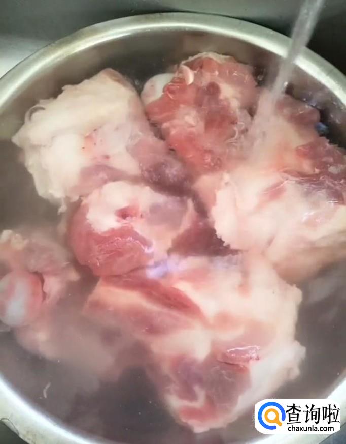 然后我们放入冷水锅中,加入葱姜,适量的料酒,煮出血沫,捞出冲洗干净