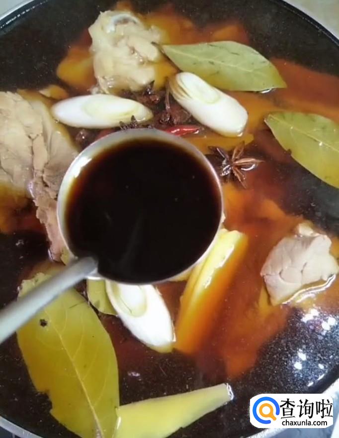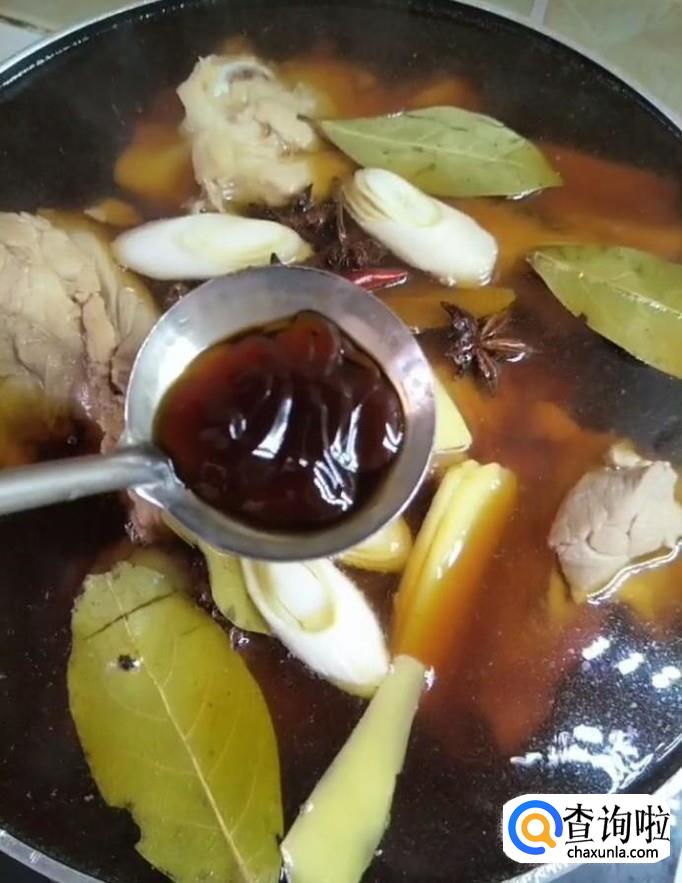 然后我们放入骨头,加入葱姜,八角,桂皮,香叶,倒入一瓶啤酒,再放入适量的酱油,蚝油,老抽,再放入适量的盐,鸡精调味