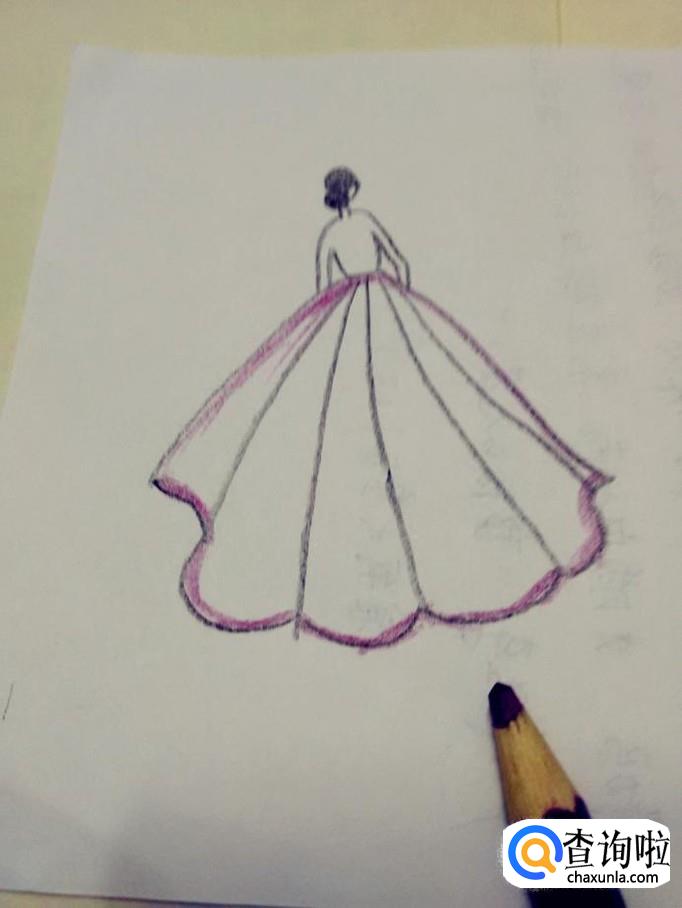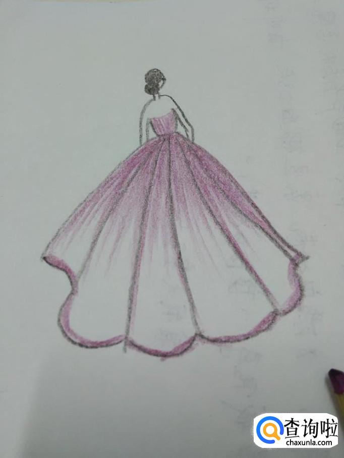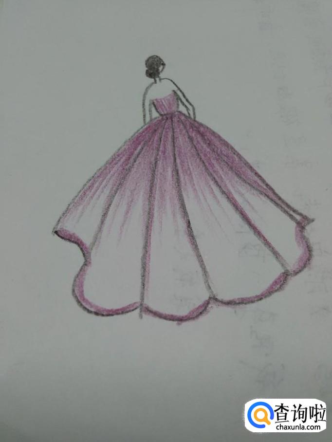 再用紫色把上身和腰间到裙子一半的部分涂上颜色,涂的时候,从腰往下呈现放射状地涂,从深到浅涂色,到此,一套晚礼服就画完了。