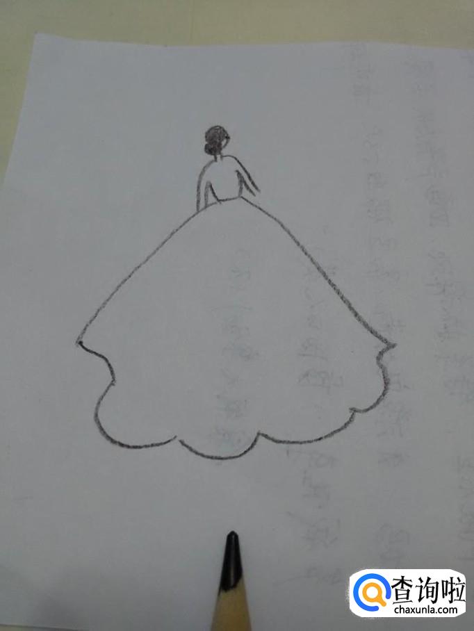 在两条斜线之间,往下画几条相连的、长短不一的弧线,表示裙摆。
