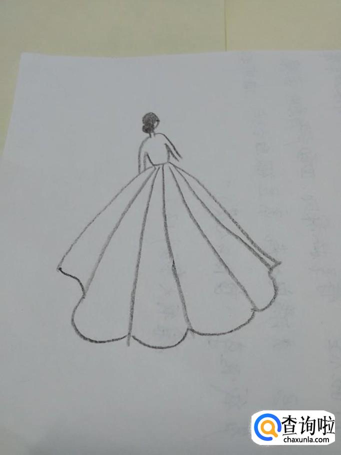 从腰间到每条裙摆弧线之间,用线连接起来,表示裙子的皱褶。