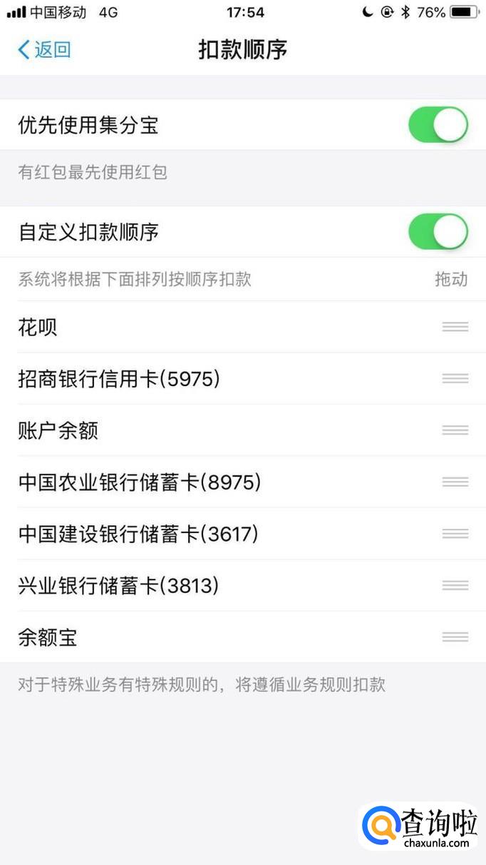 最后把花呗拉到第一位就可以了。这样做就完成我们在用支付宝付款的时候就会优先使用花呗了。