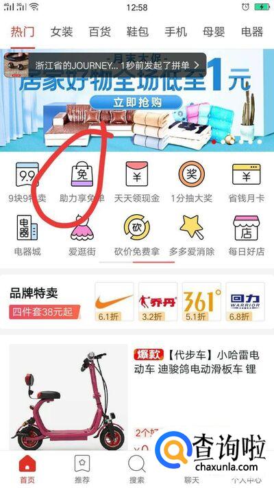 打开拼多多APP,进入首先选择首页中的【助力享免单】。