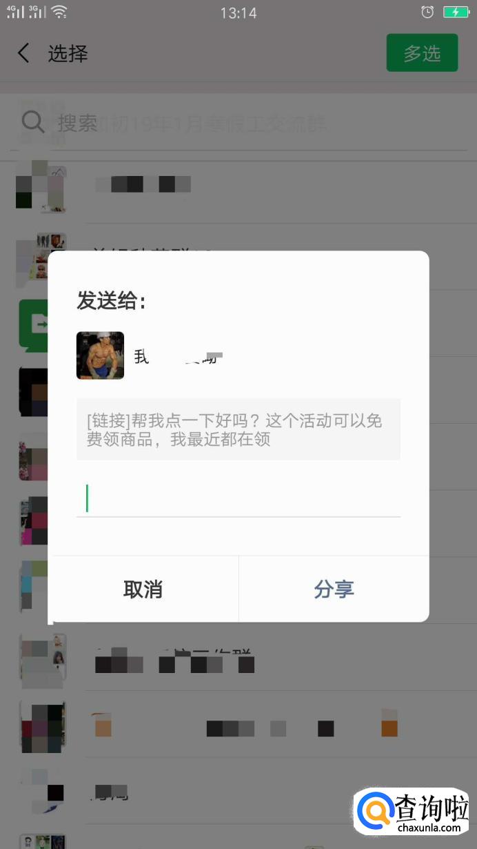 按照系统的提示内容,点击分享给微信群聊或者面对面邀请,我这里选择的是分享给微信群聊。