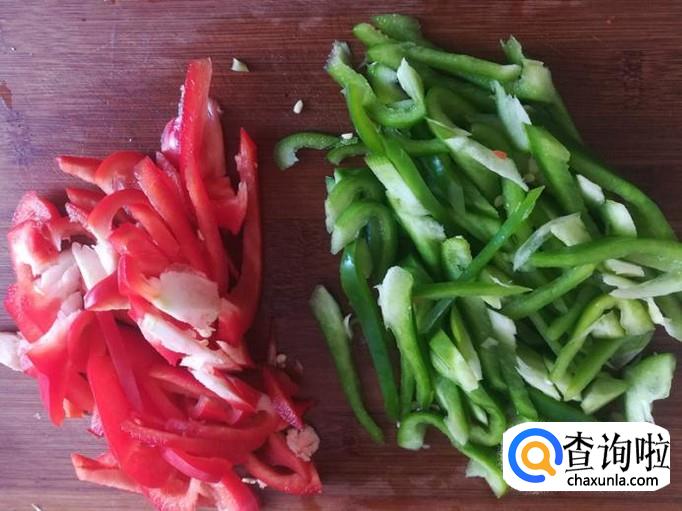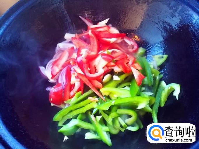 上炒菜锅,加入适量的植物油烧热,倒入切好的青红辣椒爆炒片刻。