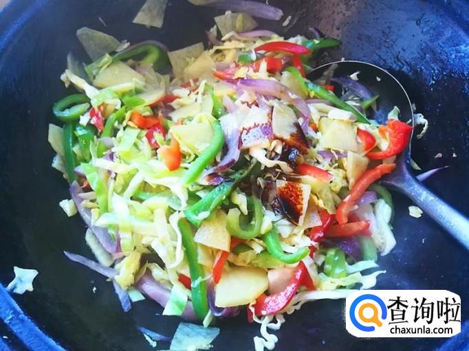甘蓝、青红辣椒、土豆片、酱油、食盐、醋、洋葱等适量