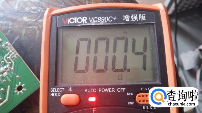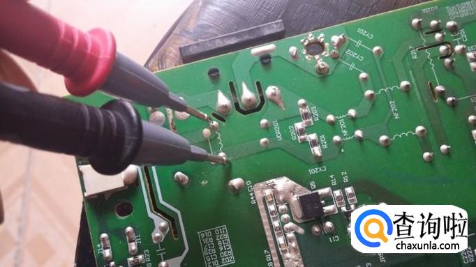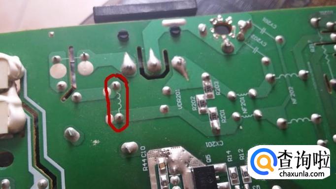先说一下电路板线路的通断。这个电路板红圈所示的两个点之间由一个电感相连,这两点之间的通断就可以用万用表测量。