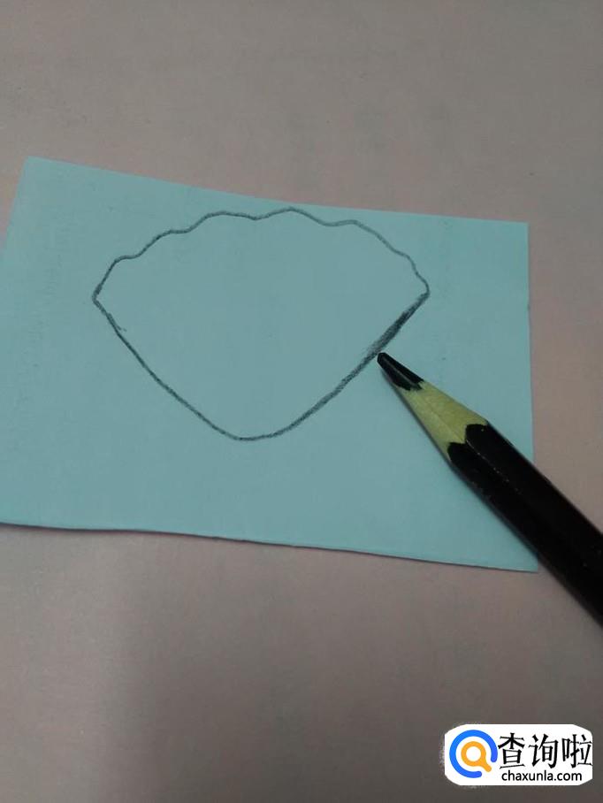 在折线的两端画一条波浪形的弧线,和折线组成一个扇形,这是贝壳的基本轮廓。