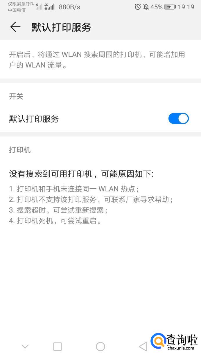 如果找不到打印机,就需要把默认打印服务开启,这样就可以顺利连接上打印机了。