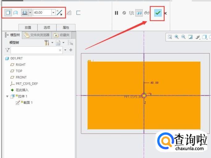 设置拉深参数,拉伸为实体,深度值为40,最后点击绿色对勾即可,如图所示。