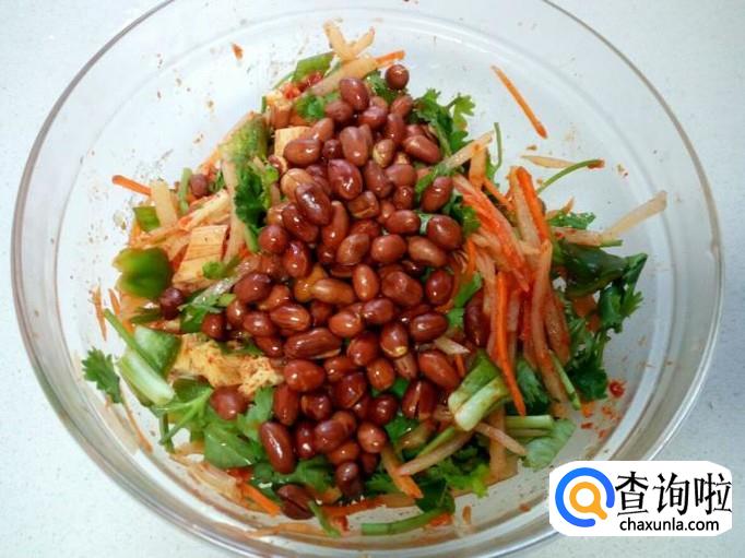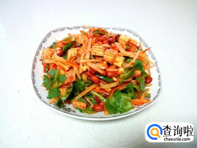 腐竹 50克 ,土豆 1个 ,胡萝卜半根,香菜 适量,青椒(麻辣)1个 ,花生米 100克。