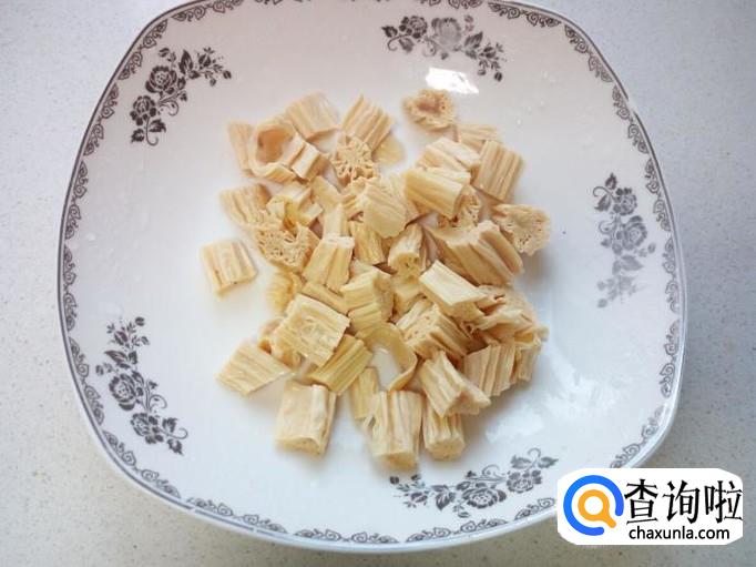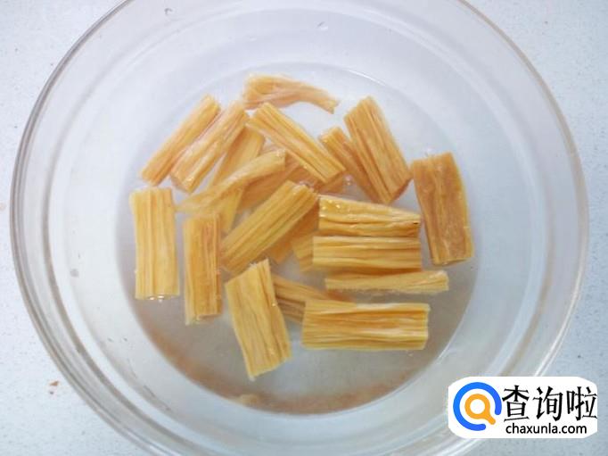 把干腐竹放入水中浸泡两个小时,浸泡腐竹变软后,用水清洗干净,控干水分,切成小段。