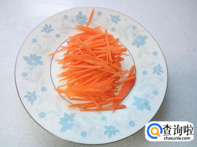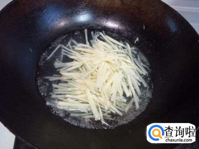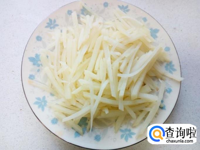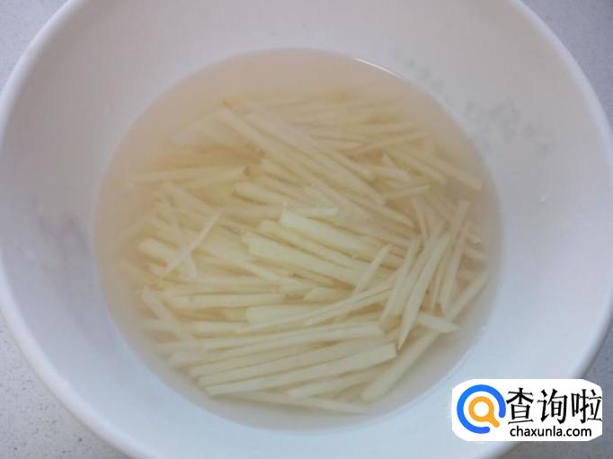 土豆去皮,用水清洗干净,切成丝,放入水中浸泡,去除上面的淀粉成分。