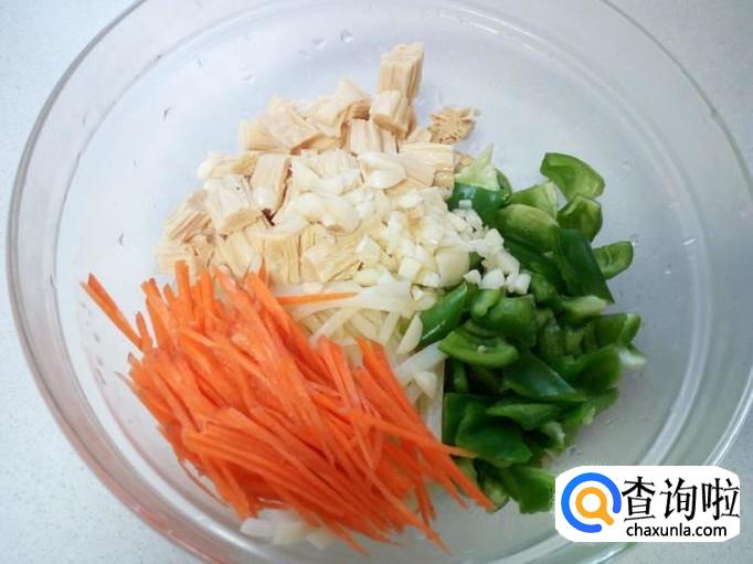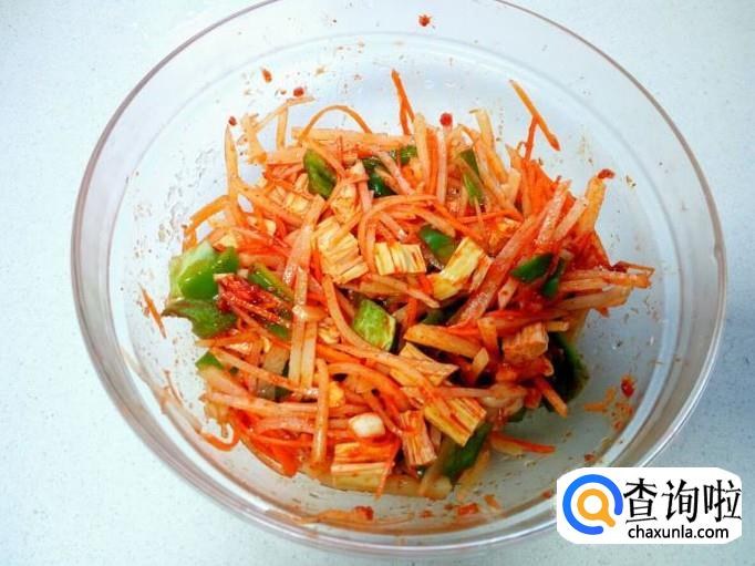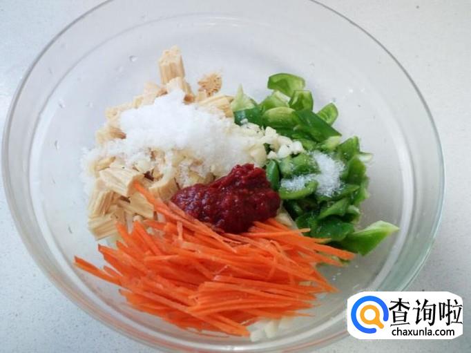 把土豆丝,胡萝卜丝,腐竹,青椒,一起放入碗中。放入一匙儿白糖,醋,盐,味精,辣酱,拌和均匀(慎重放盐,辣酱含盐成分)。