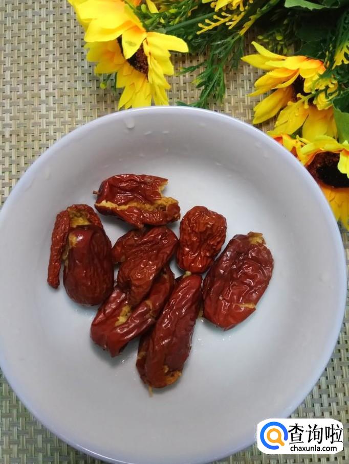 将苹果洗净,切成小块儿,再准备适量枸杞子和红枣泡一下,将红枣去核。