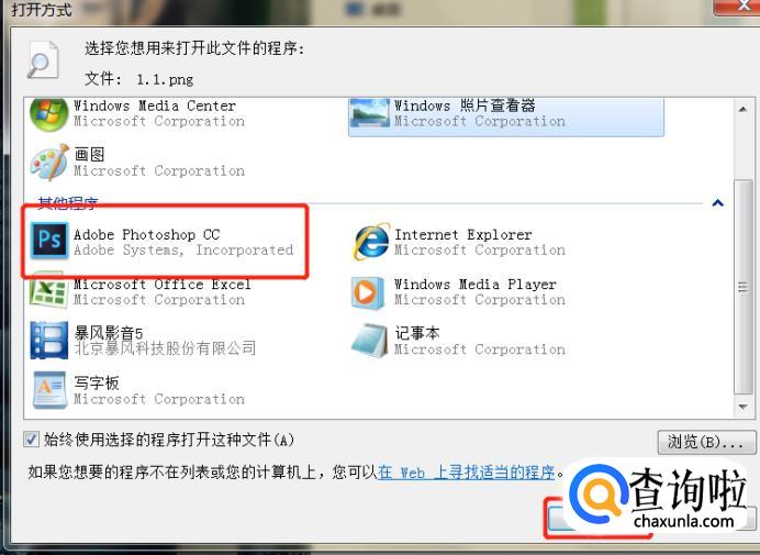 在其他程序中找到photoshop,点击确定。