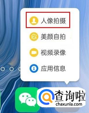 3、在“应用快捷菜单”中长按“人像拍摄”1s左右,将图标添加到桌面即可。