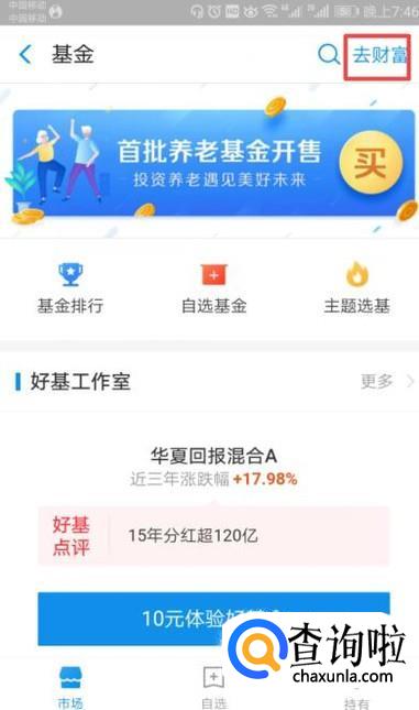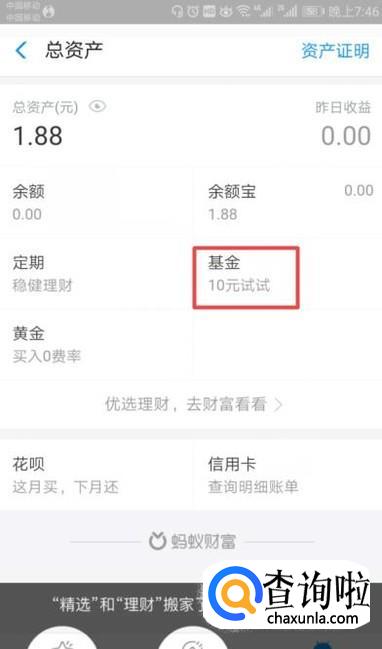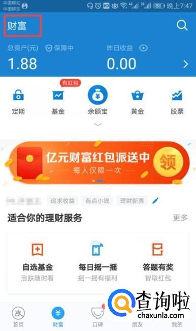 弹出的界面,我们可以看到左上角的财富,这个就是曾经的那个蚂蚁财富了,相信大家现在都知道蚂蚁财富在哪里了。
