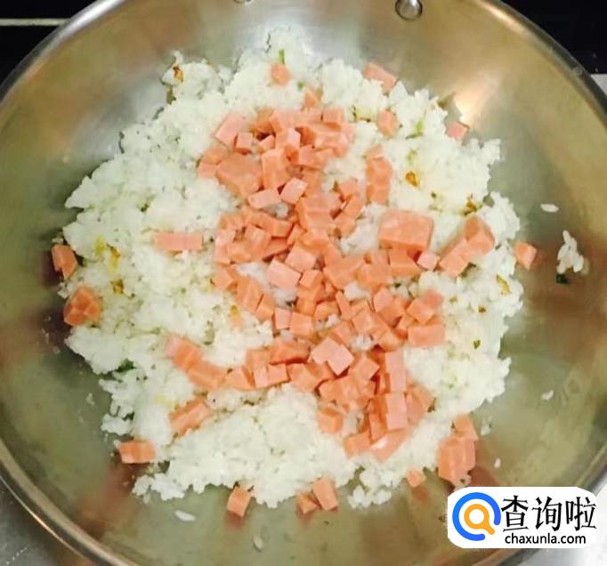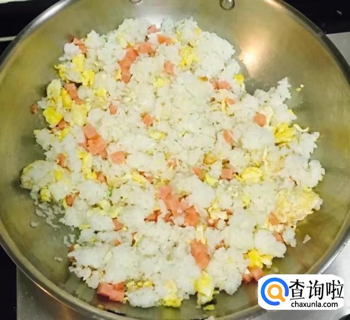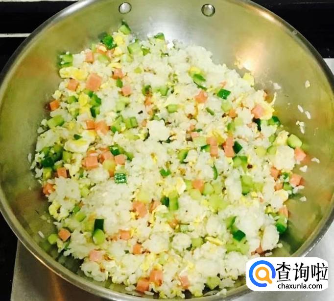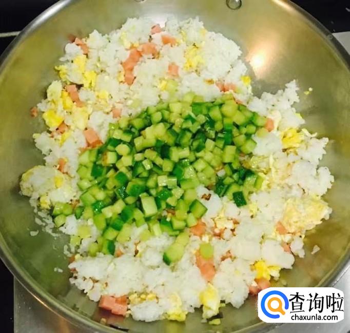 放入火腿肠丁和炒好的鸡蛋碎旺火翻炒均匀