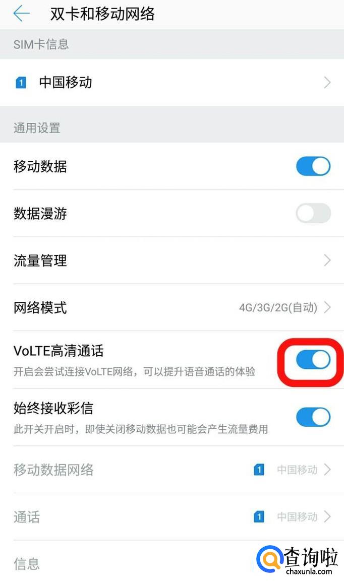 有的手机VOLTE高清通话开通按钮在SIM卡的位置设置。