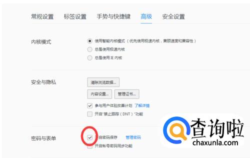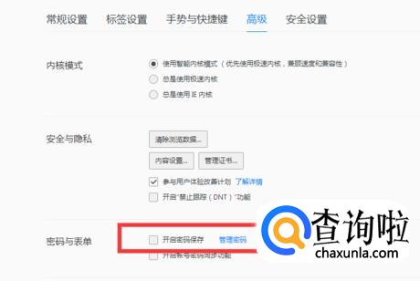 进入高级页面,在密码与表单选项中,有一个”开启密码保存“选项。