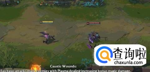 腐蚀伤疤:凯莎的普通攻击会使敌方受到等离子标记,造成额外魔法伤害。经过数次攻击后,等离子会炸裂并随着敌人失去生命而增加伤害。(邻近友军的控制技能可以叠加等离子状态)