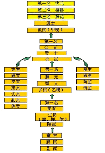 生员分为三种:成绩最好的是廪膳生员,有一定名额,由政府提供津贴和生活日用的学员;其次是增广生员,也有一定名额,为候补廪膳生之属;新“入学”的称为附学生员,为增广生之预备。每年由学政考试,按成绩等第依次升降。正式的科举考试分为三级:乡试,会试,殿试。