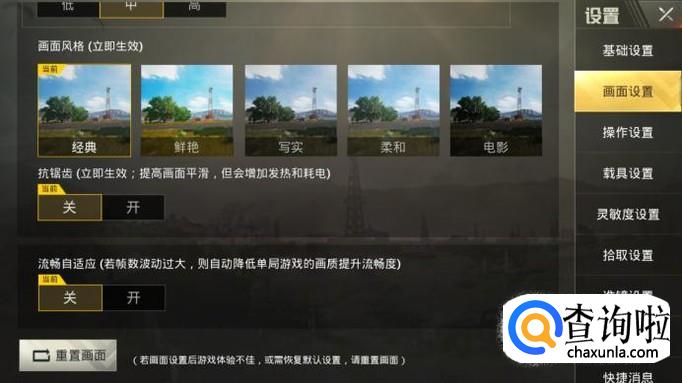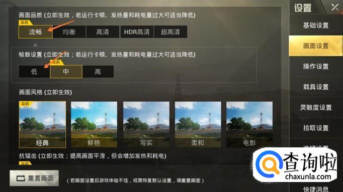 把画面和帧数都调低一些,比如想下调一档,然后向下拉找到"流畅自适应"打开,卡顿就会减少很多了。