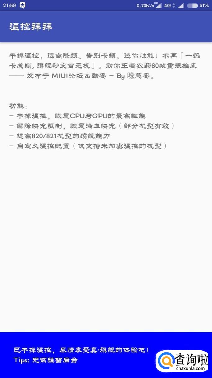 授予温控拜拜root权限,打开温控拜拜,直接一键删除温控文件,不会再受温度限制而卡顿。