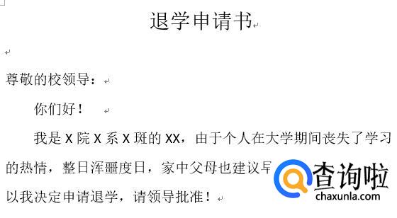 接着就要开始写正文了。先对自己进行一个比较简单的自我介绍,姓名、班级、性别。之后就说明自己为什么要退学,有什么原因,要如实的写。最后就是在申请书最后一段留两格空白,写上“望领导批准” 。