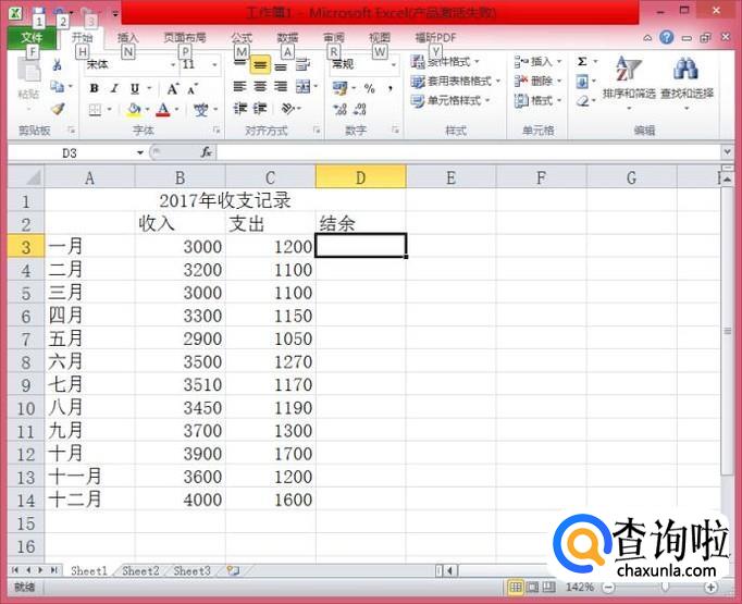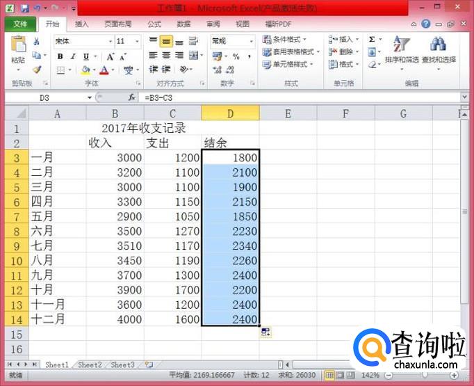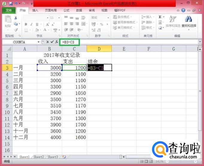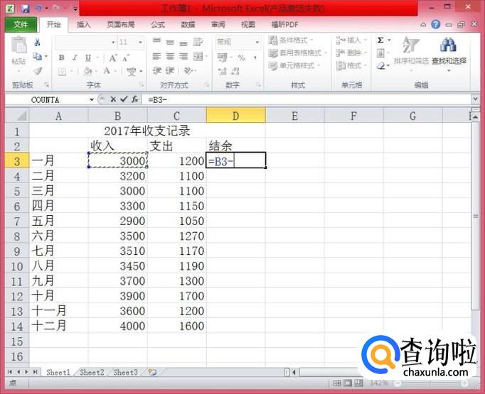 在继续用鼠标点击C3单元格,此时,D3单元格的内容为“=B3-C3"