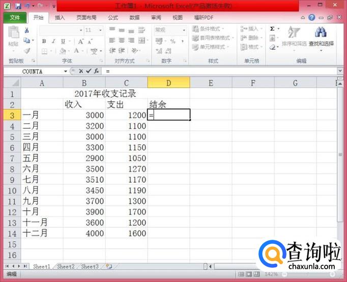在D3单元格中输入一个“-”,此时,D3单元格的内容为“=B3-"