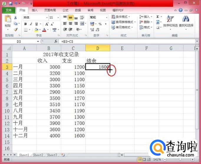 公式输入完成后,按”enter“键,就会看到第一个月的结余已经算出来了