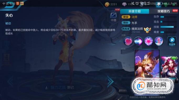 如果妲己的技能命中敌方,将会减少目标30—72点法术防御,最多叠加三层,减少幅度随着英雄等级提升而成长!
