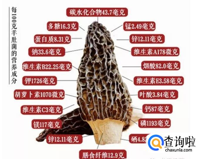 2、据测定羊肚菌至少含有8种维生素:维生素B1、维生素B2、维生素B12、烟酸、泛酸、吡哕醇、生物素、叶酸等。羊肚菌的营养成份,可与牛乳、肉和鱼粉相当。因此,国际上常称它为“健康食品”之一。羊肚菌含抑制肿瘤的多糖,抗菌、抗病毒的活性成分,具有增强机体免疫力、抗疲劳、抗病毒、抑制肿瘤等诸多作用,日本科学家发现羊肚菌提取液中含有酪氨酸酶抑制剂,可以有效地抑制脂褐质的形成。