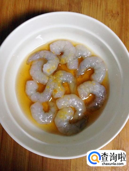 我这里用的是海虾大虾仁,个头比较大,肉质鲜嫩,口感Q弹,用来炒菜最是合适。大虾仁室温解冻后,用清水冲洗,沥干水分放入碗中,依次加入1小勺料酒和生姜粉,再加入半小勺盐,拌匀后静置5分钟左右。