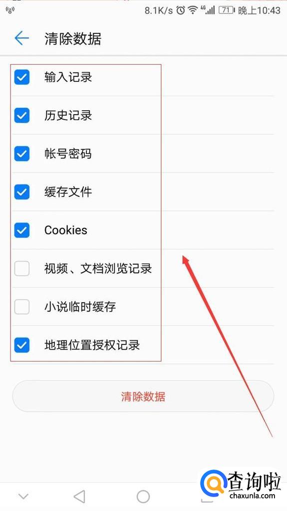 点击“清理数据”后,就来到了我们的数据选择界面,在这里我们可以选择一些我们需要清理掉的东西,如“输入记录”、“历史记录”、“账号密码”、“缓存文件”等等具体的内容,我们勾选就表示我们要清理掉。清理之后,我们在打开网页,就会改善啦。