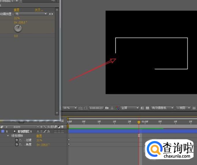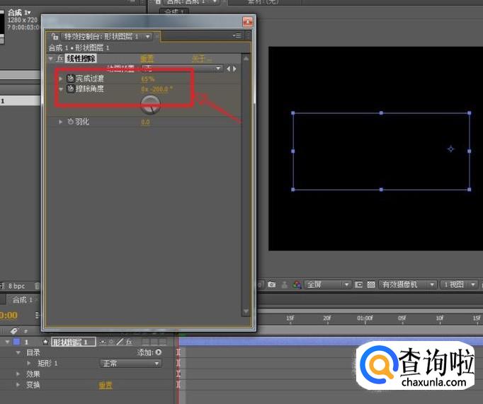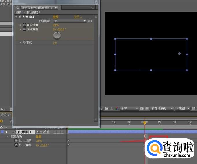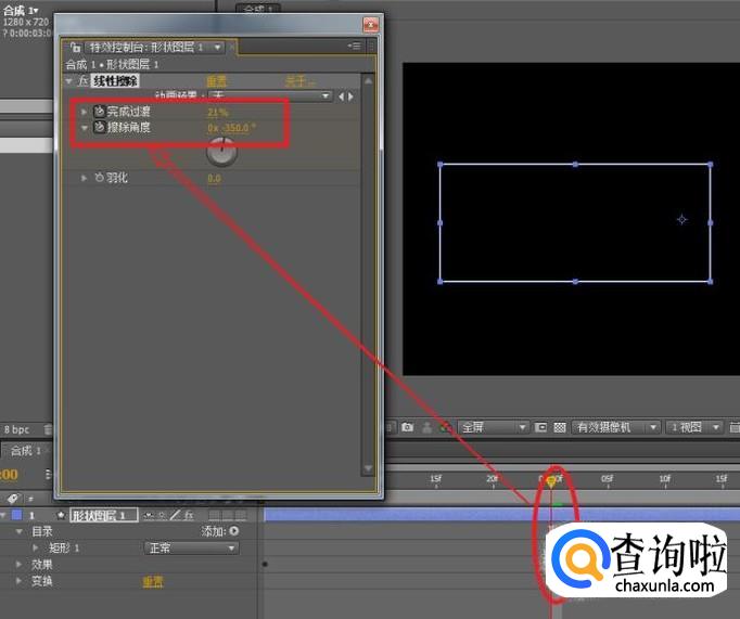移动时间线指针到第一帧,为完成过渡与擦除角度属性添加关键帧,按照图示调整属性。
