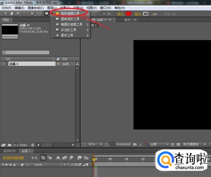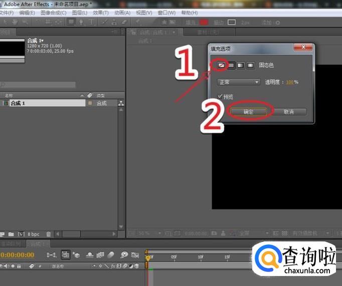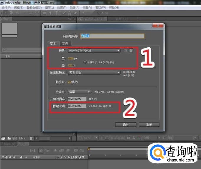 执行:图像合成>新建合成组命令,在弹出的合成设置窗口,将预置设为:HDV/HDTV 720,持续时间设为:3秒。